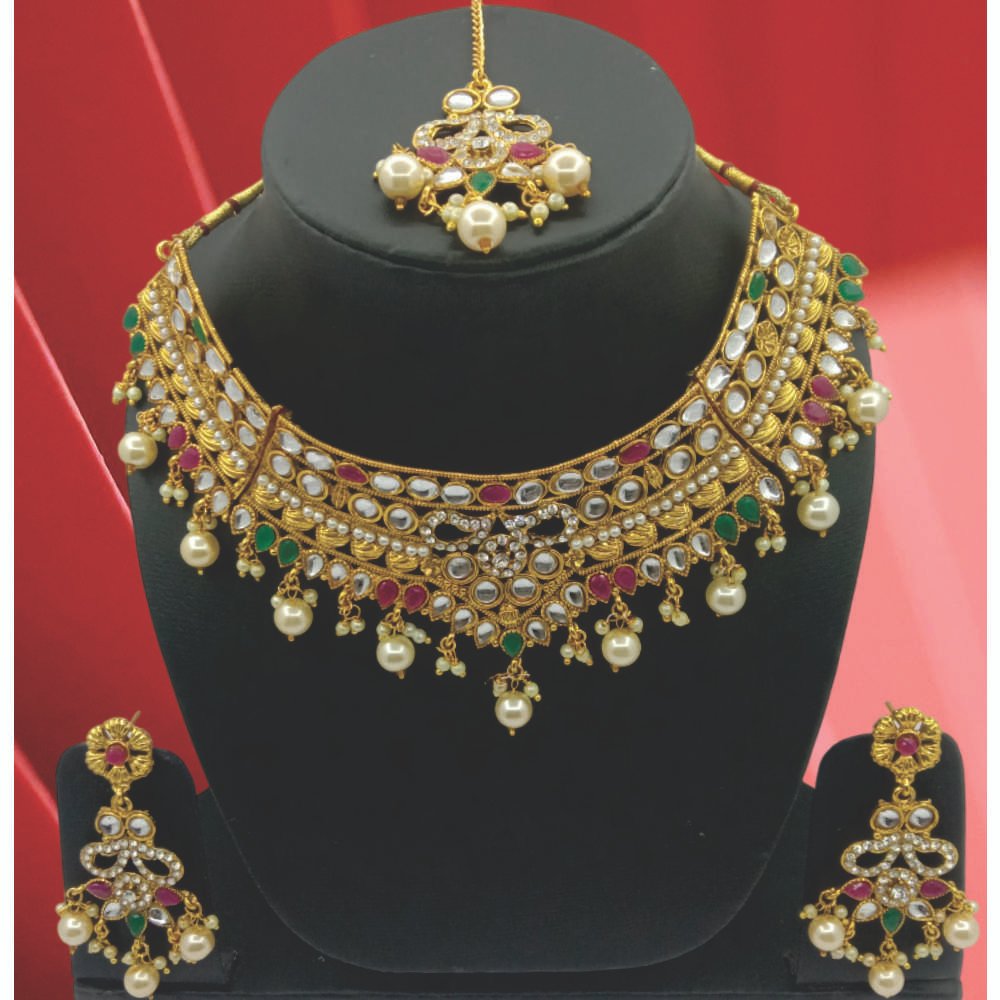 Elevate your ethnic look with this exquisite Bridal Kundan Meenakari Choker Necklace Set. Designed for brides and festive occasions, this set features a grand choker necklace adorned with high-polish gold plating, traditional kundan stones, colorful meenakari work in green and magenta, and dangling pearl beads. The set includes a pair of matching earrings and a beautiful maang tikka, making it a complete accessory for weddings, festivals, or party wear. Crafted with fine detailing, this jewelry set adds royal elegance and traditional charm to your attire.
